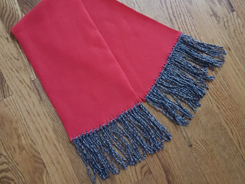 This one has a beautiful yarn fringe, and while it takes a little longer than the first two scarves I shared (Fleece Scarf and Fringed Fleece Scarf), I think you will agree that the extra effort is worth it!
