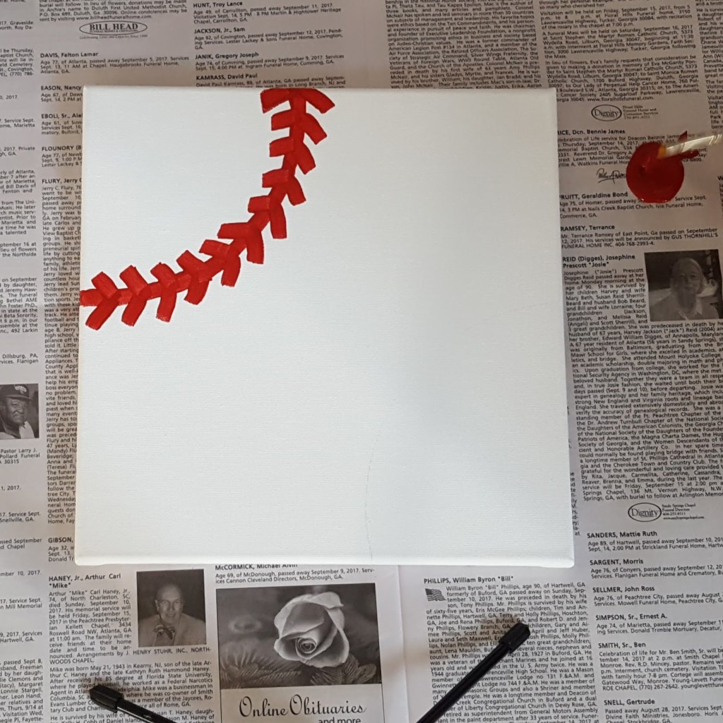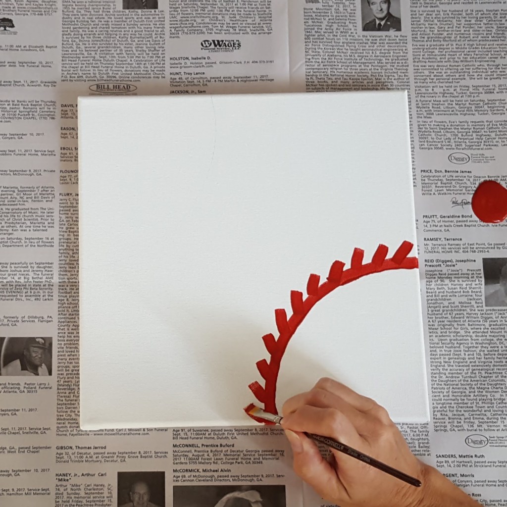 - Paint on the side stitches at an angle to the main curve (use a baseball or this picture as a guide for placement and spacing).