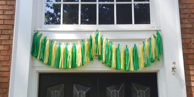 Today, I’ve got an easy DIY garland that you can leave outside, use to decorate the tent at a tailgate party, or the deck railing in your back yard! And the best part is that it’s made from plastic tablecloths from a dollar store!