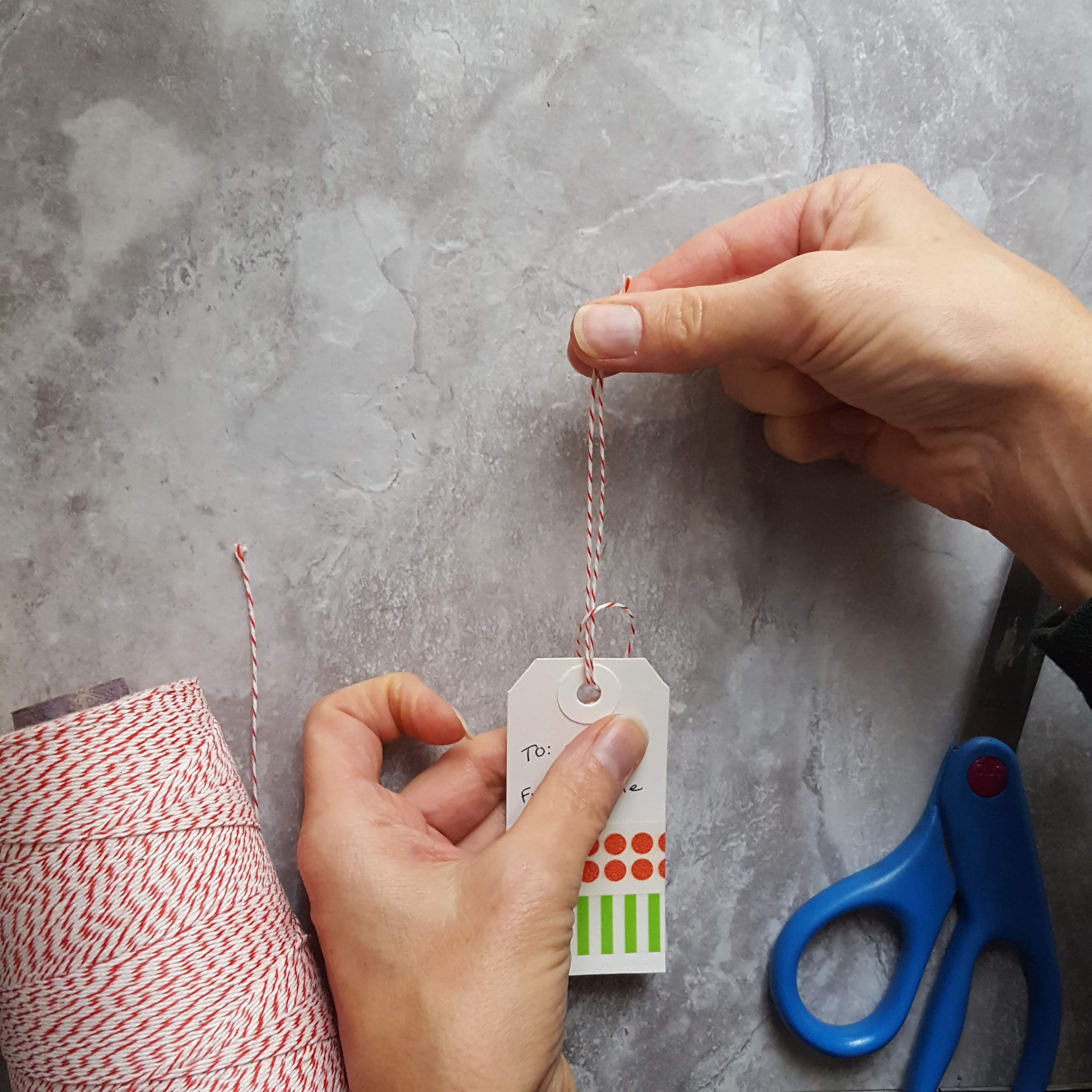 - Push the ends through the hole in the tag, then through the fold in the twine, and pull to tighten