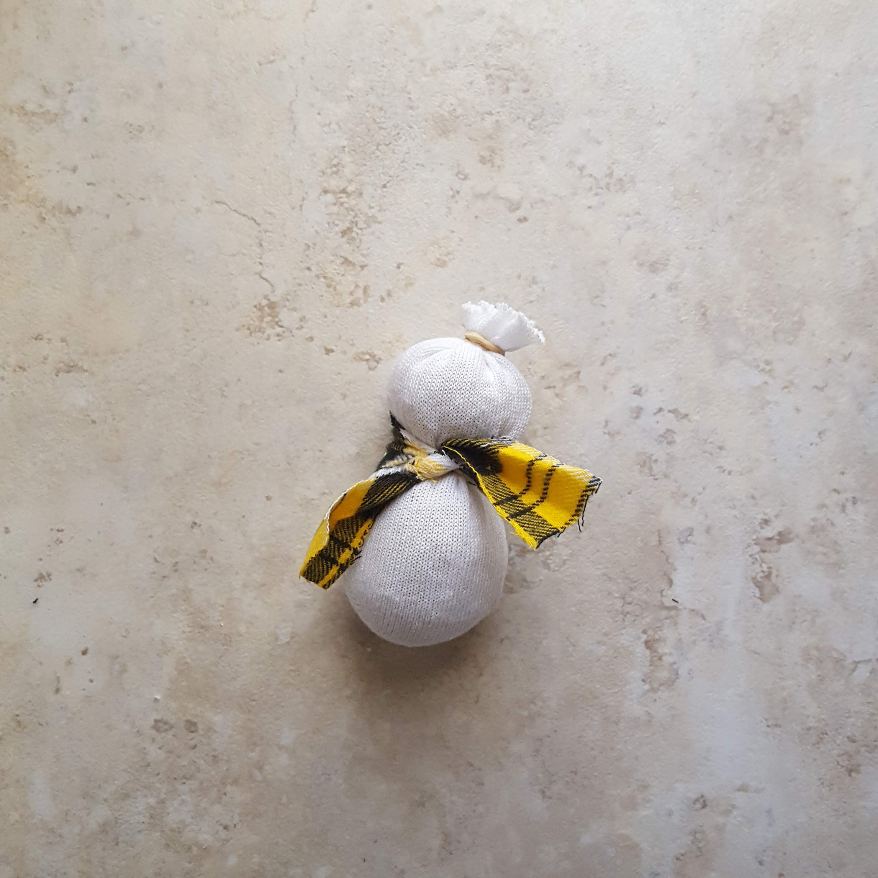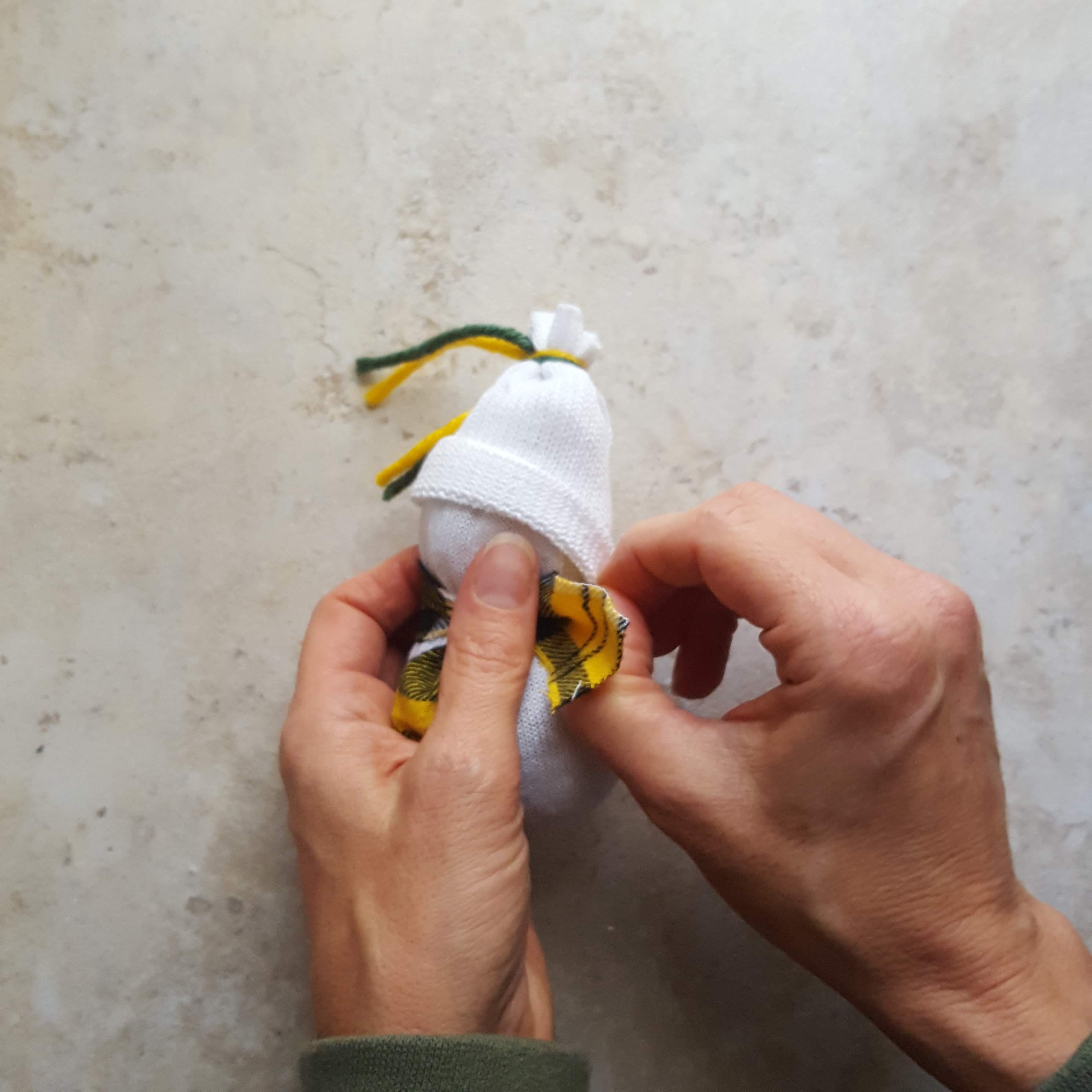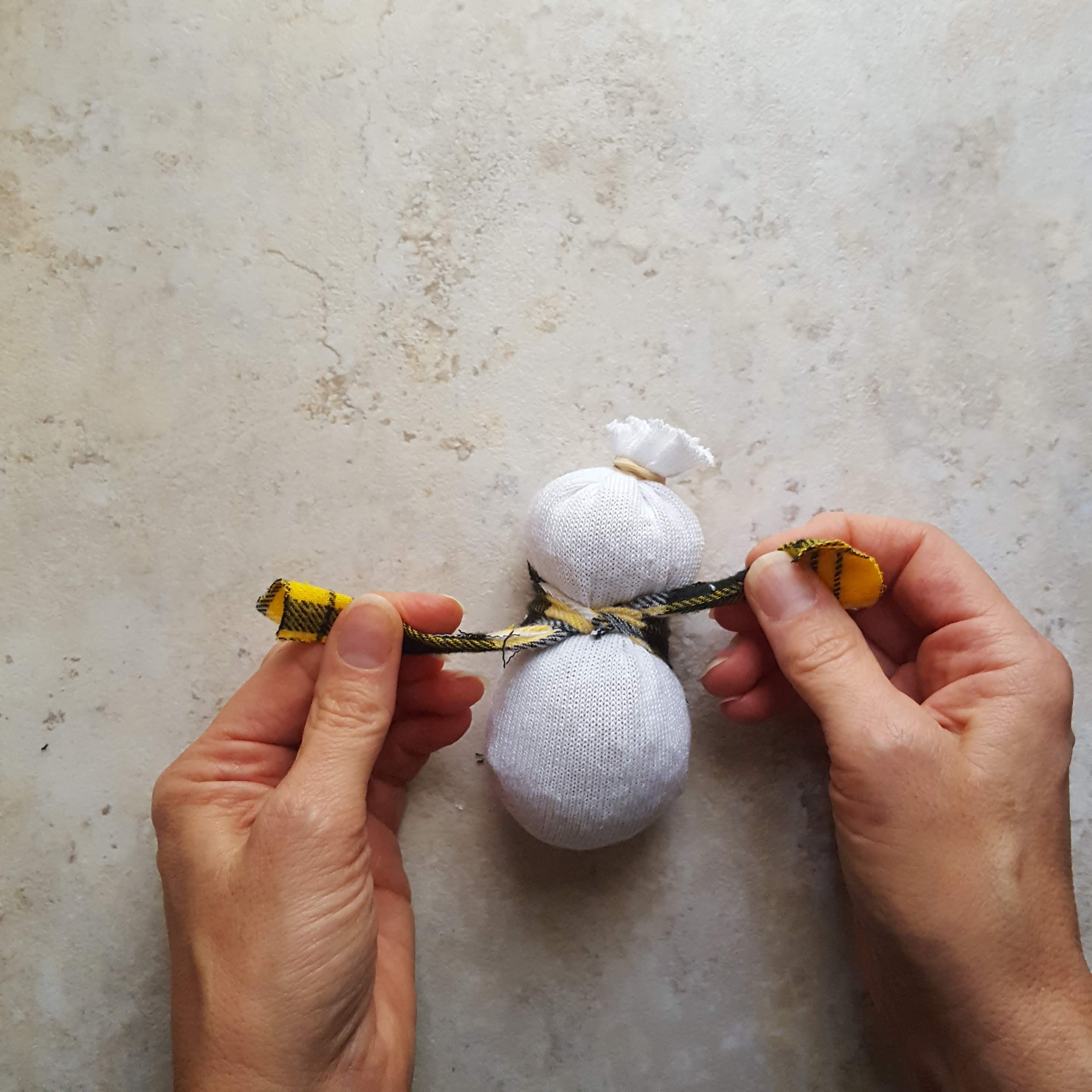 - Tie the flannel (or yarn) around the middle of the snowman, to create a body and head