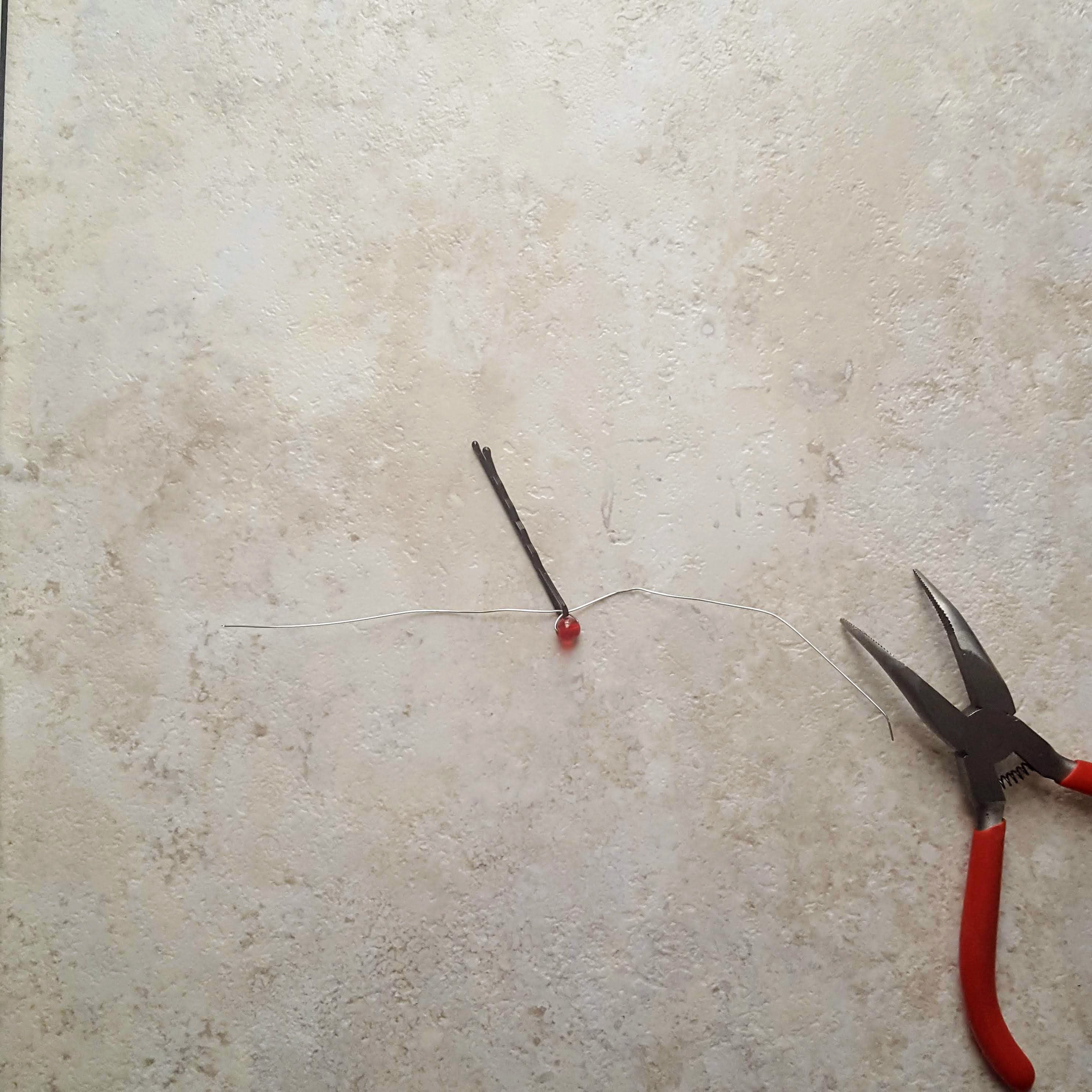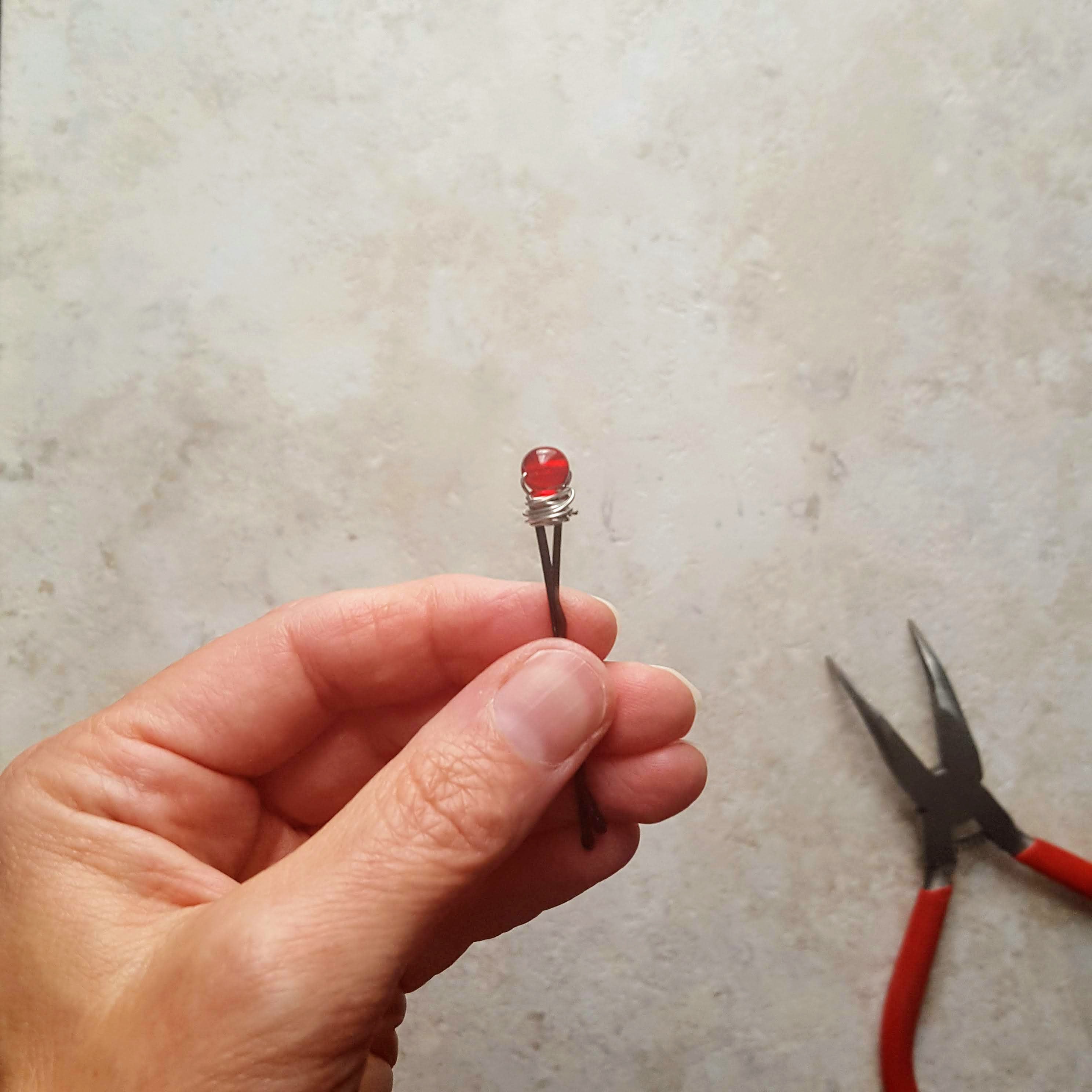 Use the jewelry pliers (or your fingers) to wind the other end around the head of the bobby pin and the wire coming out of the bead’s hole.