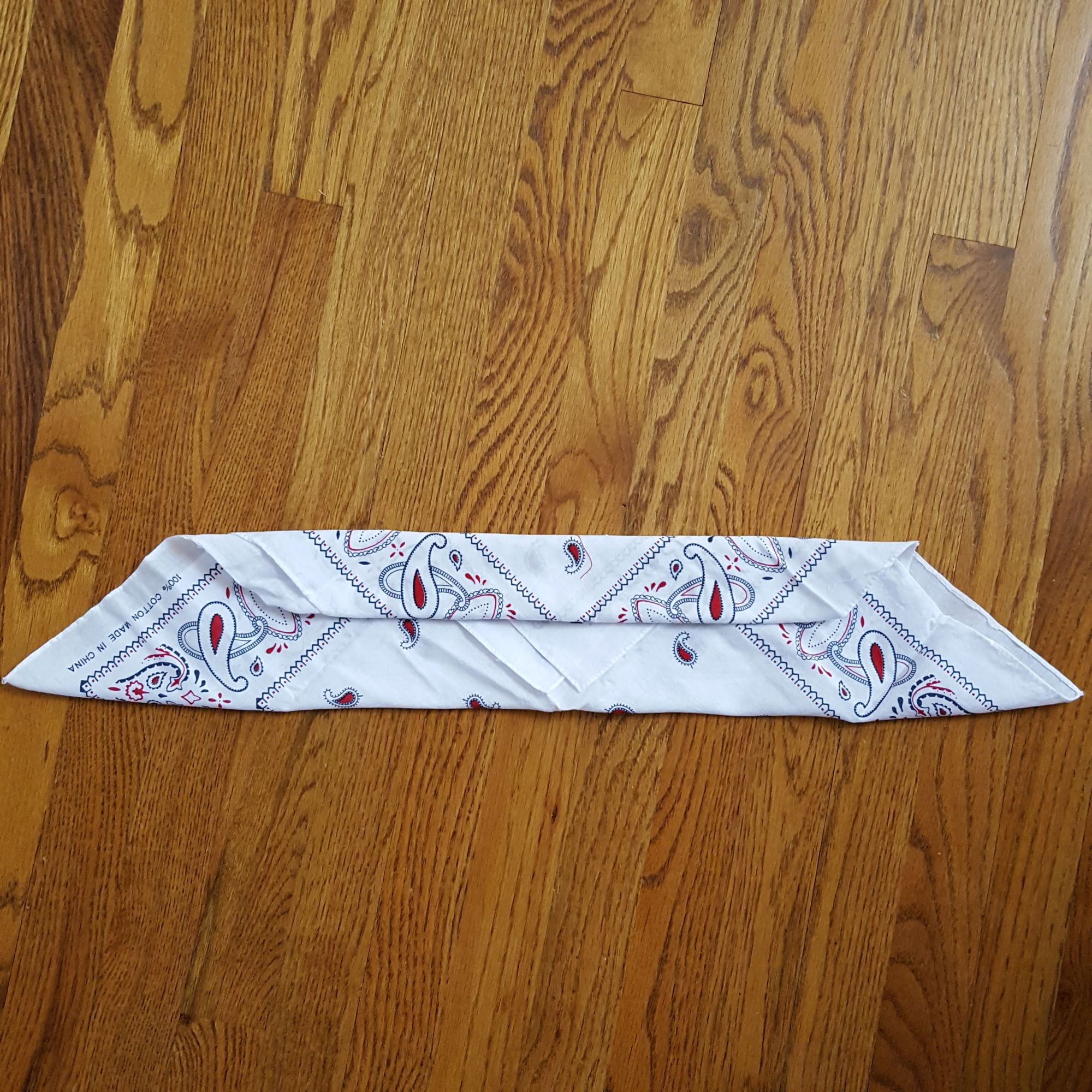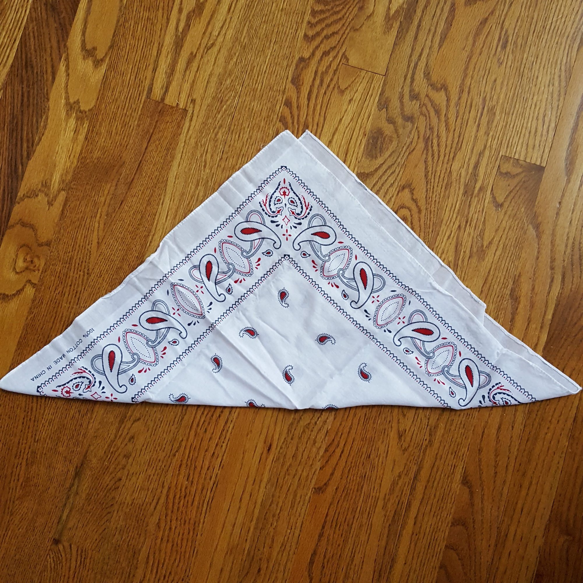 The first thing you need to know is that a bandana is traditionally a square of cotton, with some kind of a paisley print on it. Many more patterns and materials are available today, and any square scarf you might have will work well for these looks.