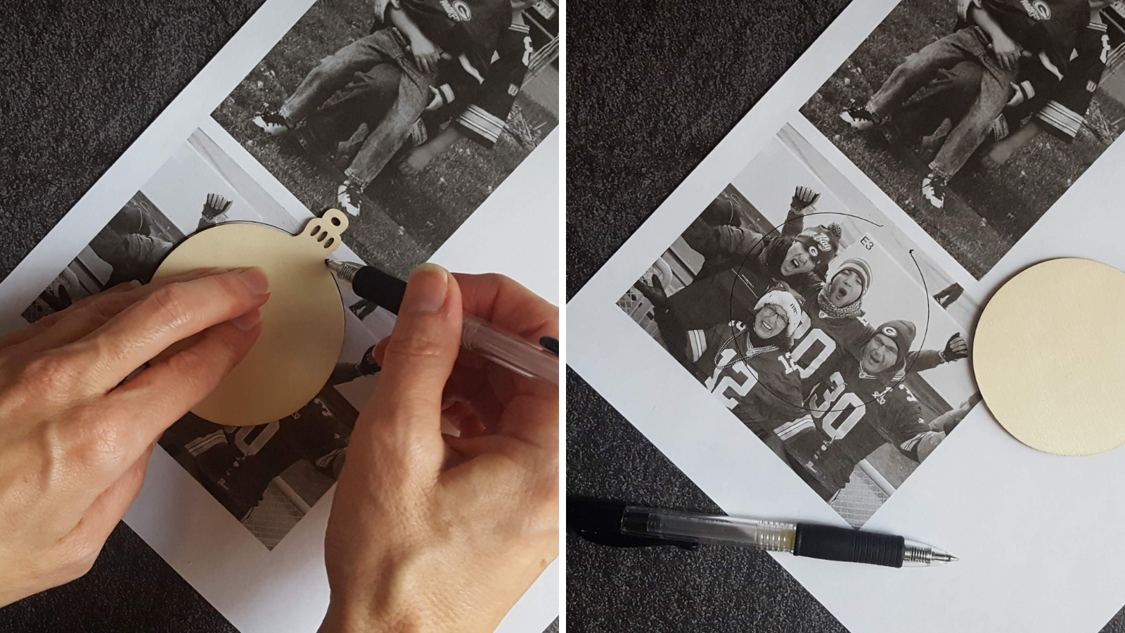 One – Trace the ornament shape onto your photos, making sure you center the photo the way you want it to look on your finished ornament.