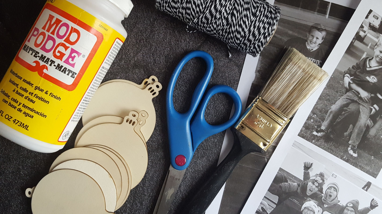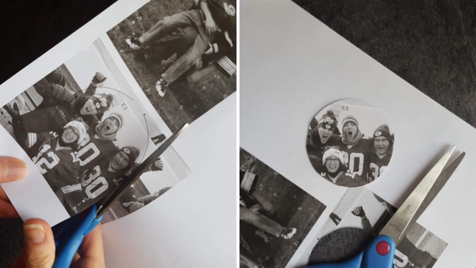 Two – Cut out the circles you traced onto the photos. You can cut them to fit the ornament exactly, or slightly smaller to leave a border.