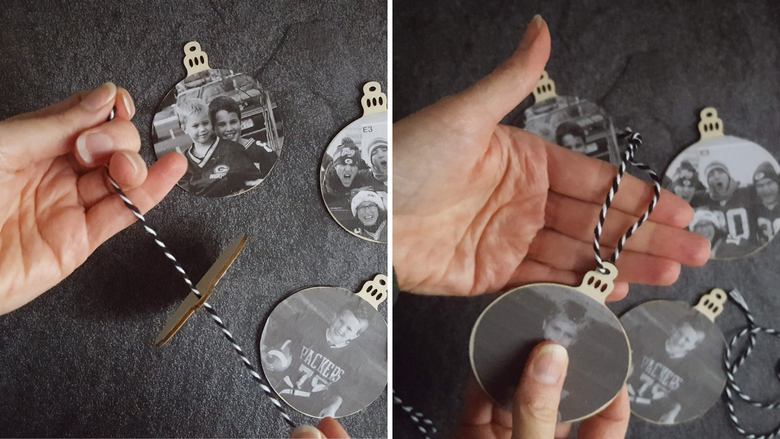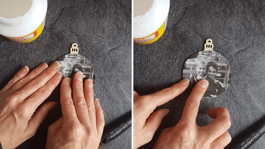 Four – Put the photo in place on top of the ornament. Make sure its straight, then smooth it down using your fingers, gently pressing out any air bubbles.