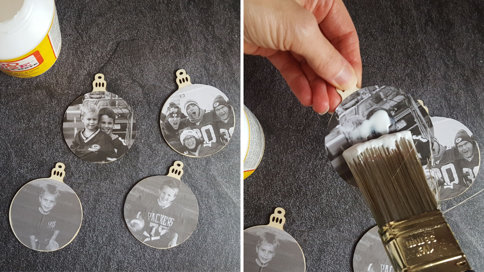 Three – Use a paintbrush to spread a thin layer of Mod-Podge on the front of the ornament. I found it easiest to hold onto the “hangar” part of the ornament, while applying to the “ball.”