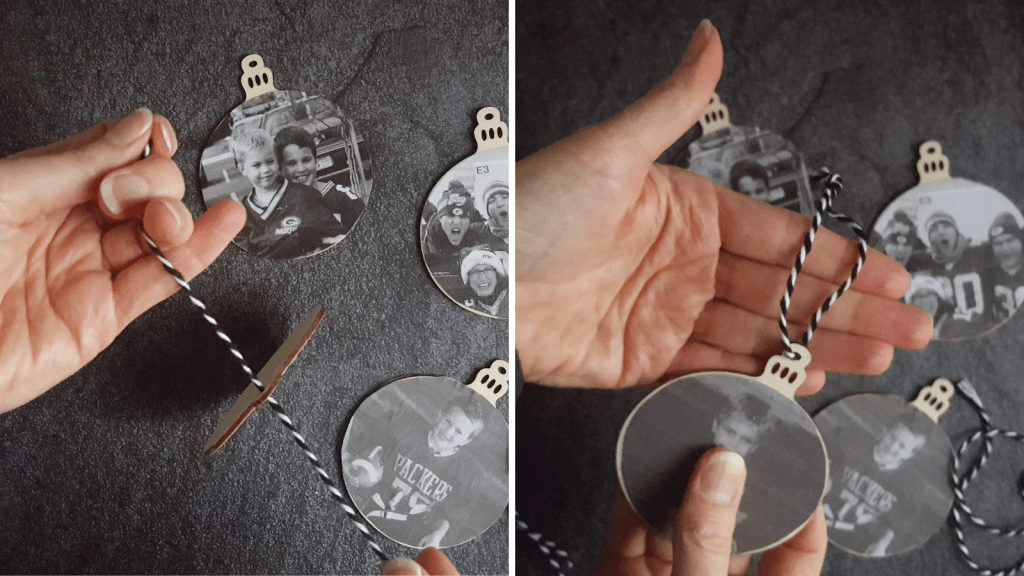 - Use a black sharpie to fill in any raw wood showing on the front of the ornament, if your circle cutting wasn’t perfect (mine wasn’t)!