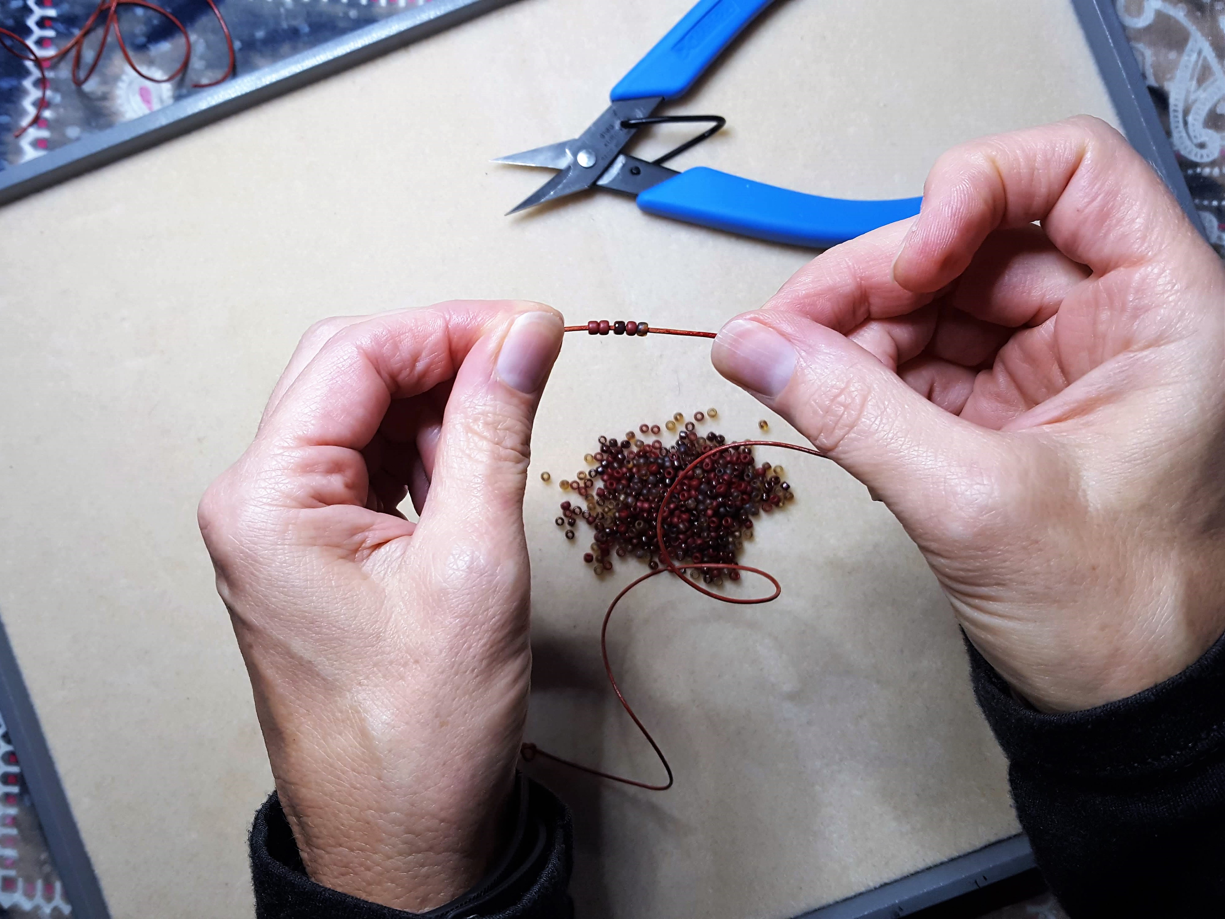 Start stringing beads on the 18” piece of leather. You can create a pattern, or string the beads totally randomly like I did.