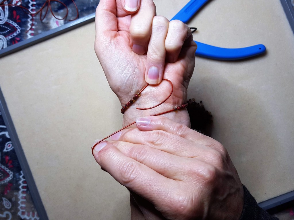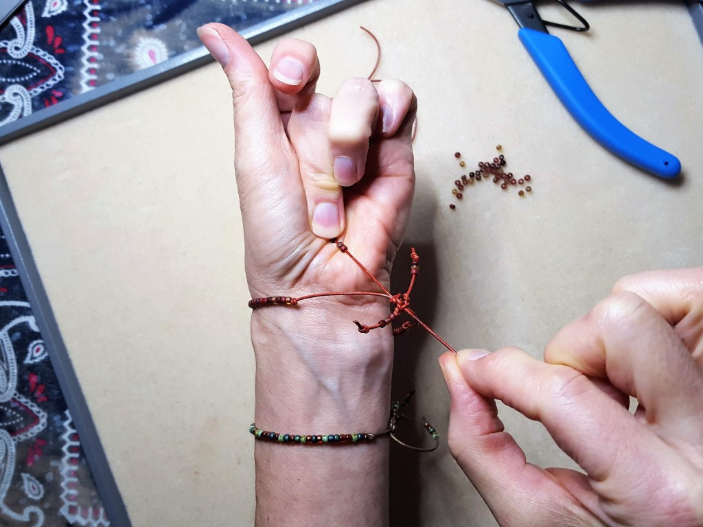 But if you want to be able to take the bracelet off, you need to create this sliding knot. The sliding knot lets you open the bracelet wide enough to fit over your hand, then pull it tight enough to fit your wrist.