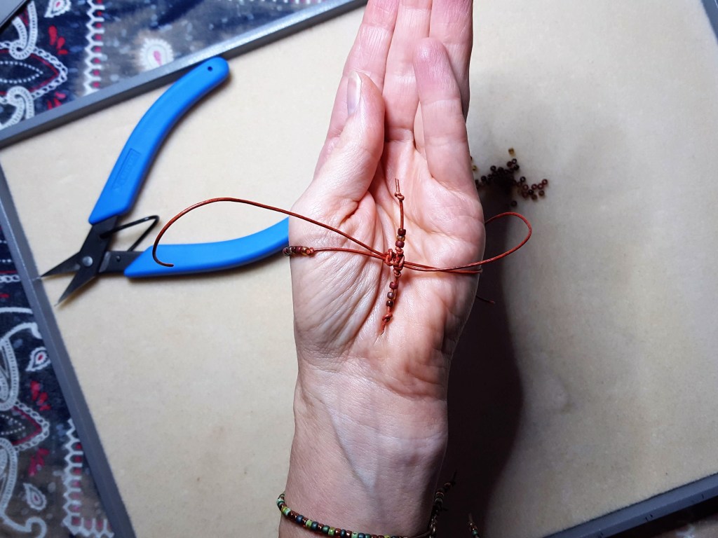 - Lay the right side cord over the left cord, then bring it under the bracelet ends, and up through the top part of the “4” shape.