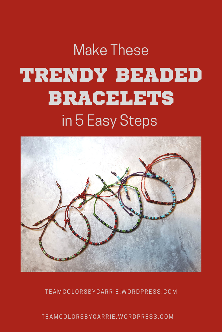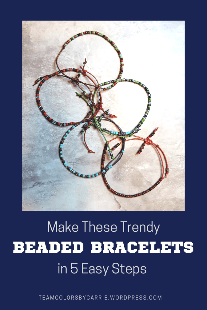 Welcome back, sports fans! You are probably wondering what a DIY bracelet post has to do with sports, but stick with me, because you could easily make a stack of these fun bracelets in your favorite sports team colors!