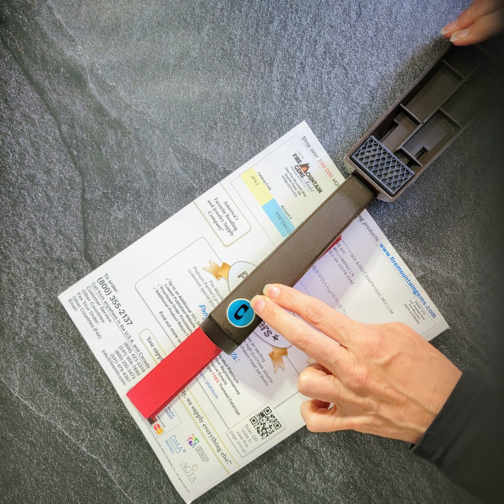 If your stapler is not long enough to reach, open up the stapler, place the stack on a magazine or catalog, and push a staple through the stack. You’ll need to manually fold over the ends of the staple on the back side.