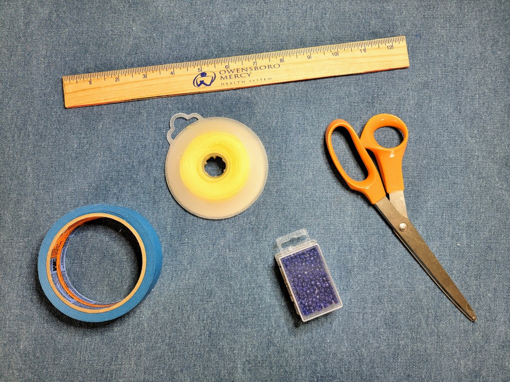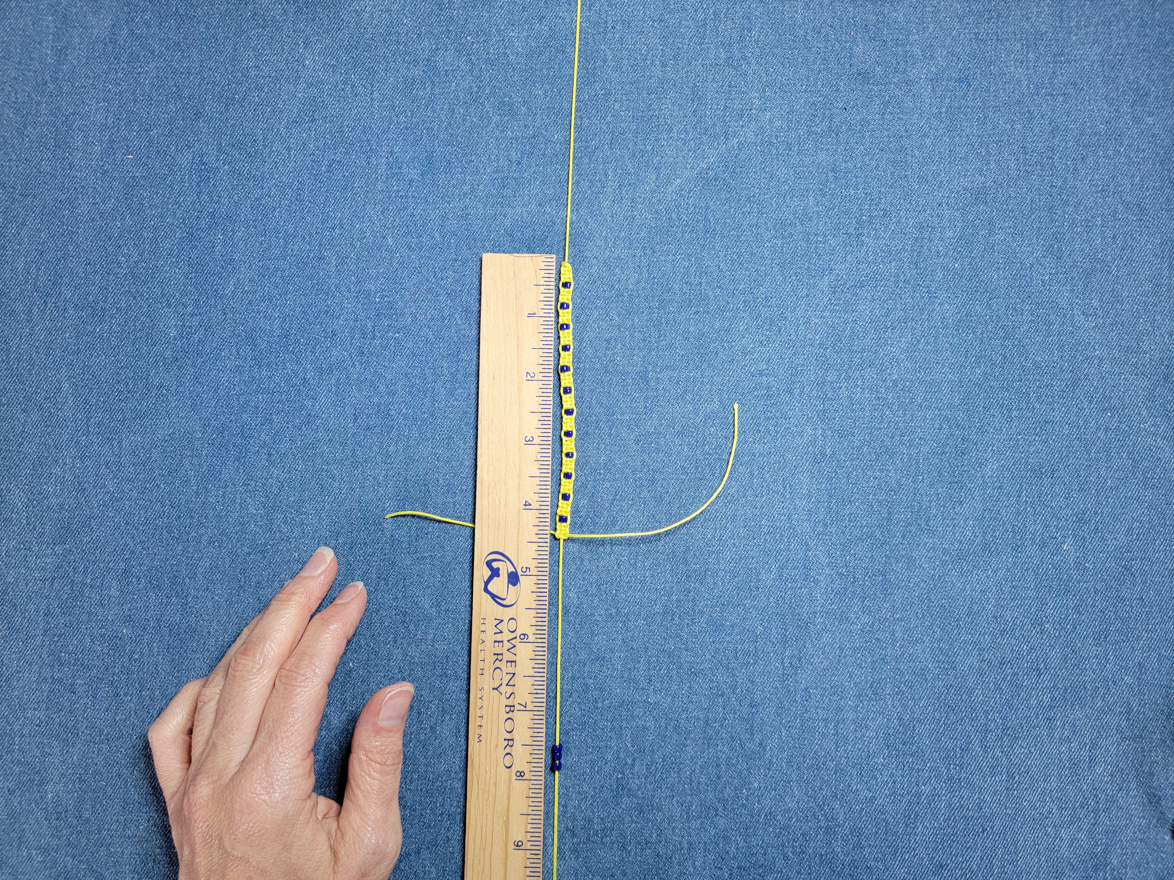 d. Slide about 12 beads onto the base cord, then tape down the bottom of the cord.