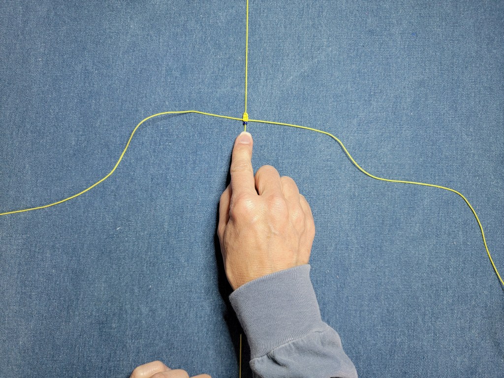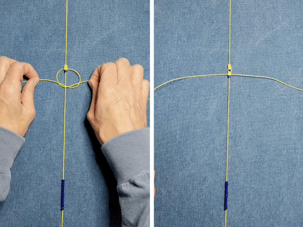 e. Find the center of the 36″ piece of cord, and use a simple overhand knot to attach it the base cord, about 7″ from the top end of the base cord.