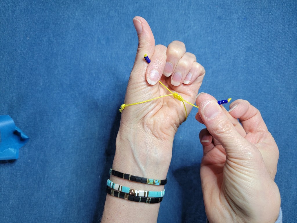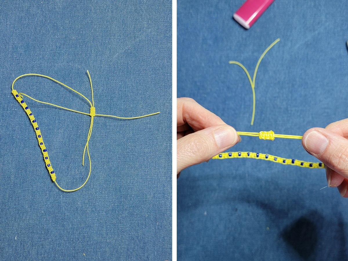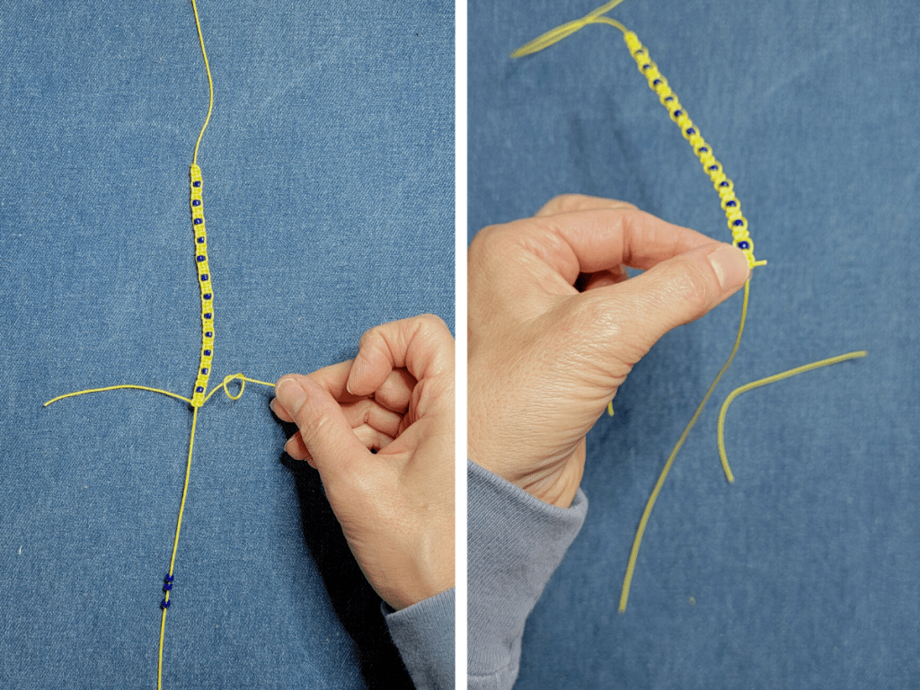 d. Use that new cord to create macramé knots, the same way you did in step 2, making sure you catch both ends of the bracelet in the knots.