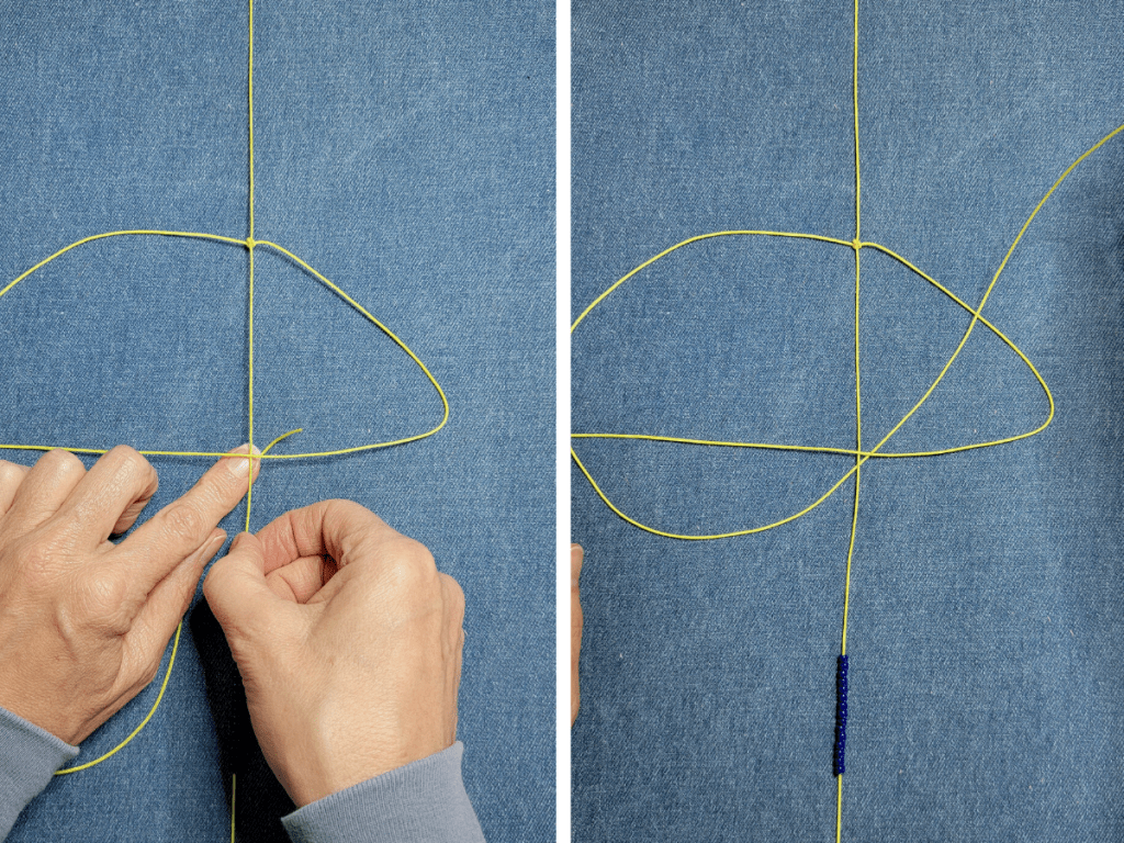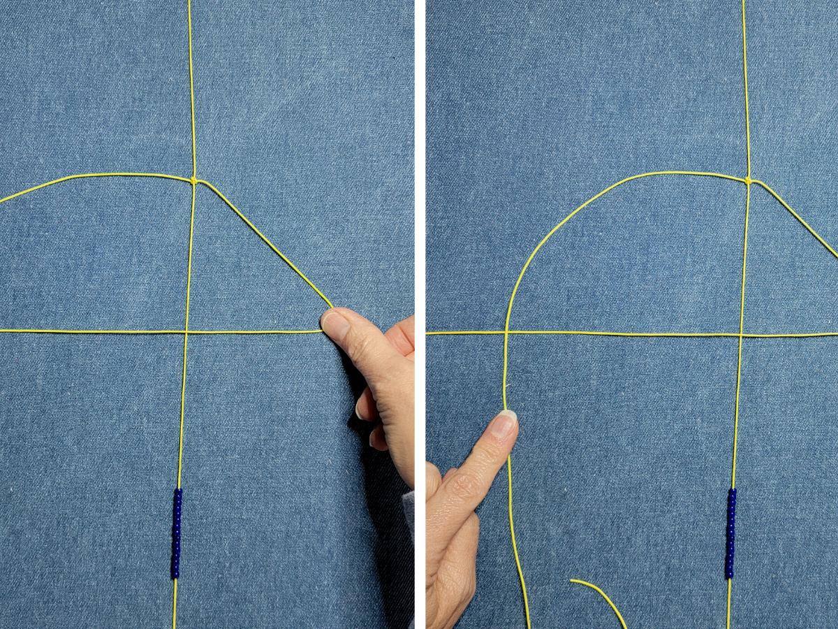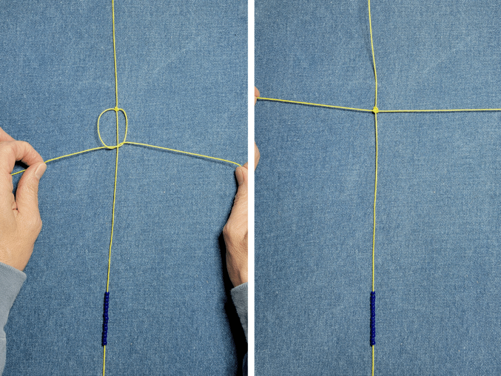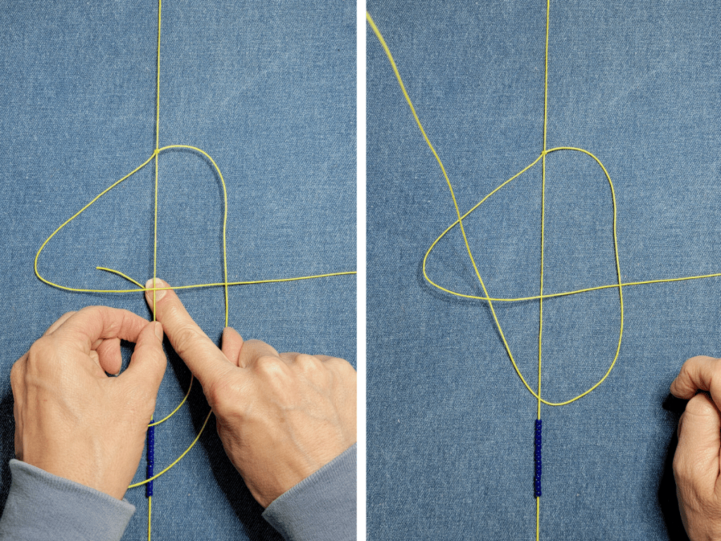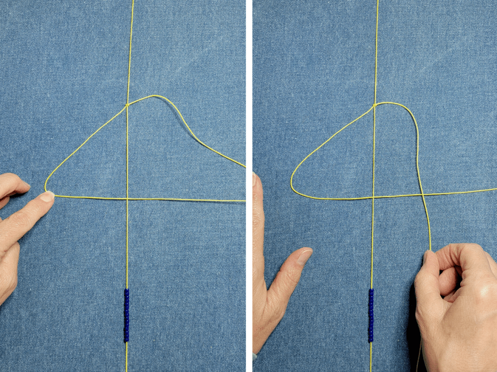 c. Bring the right cord under the base cord, and up through the top part of the “4” shape.