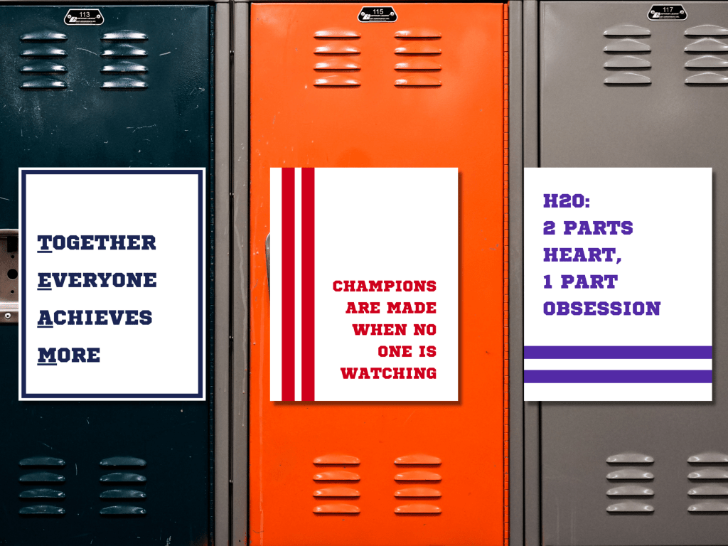 ONE – Why not decorate their locker door with something inspirational, in their team colors! To make it easy, you can purchase any of these designer sports graphics, download them instantly, and print out as many as you need at home.