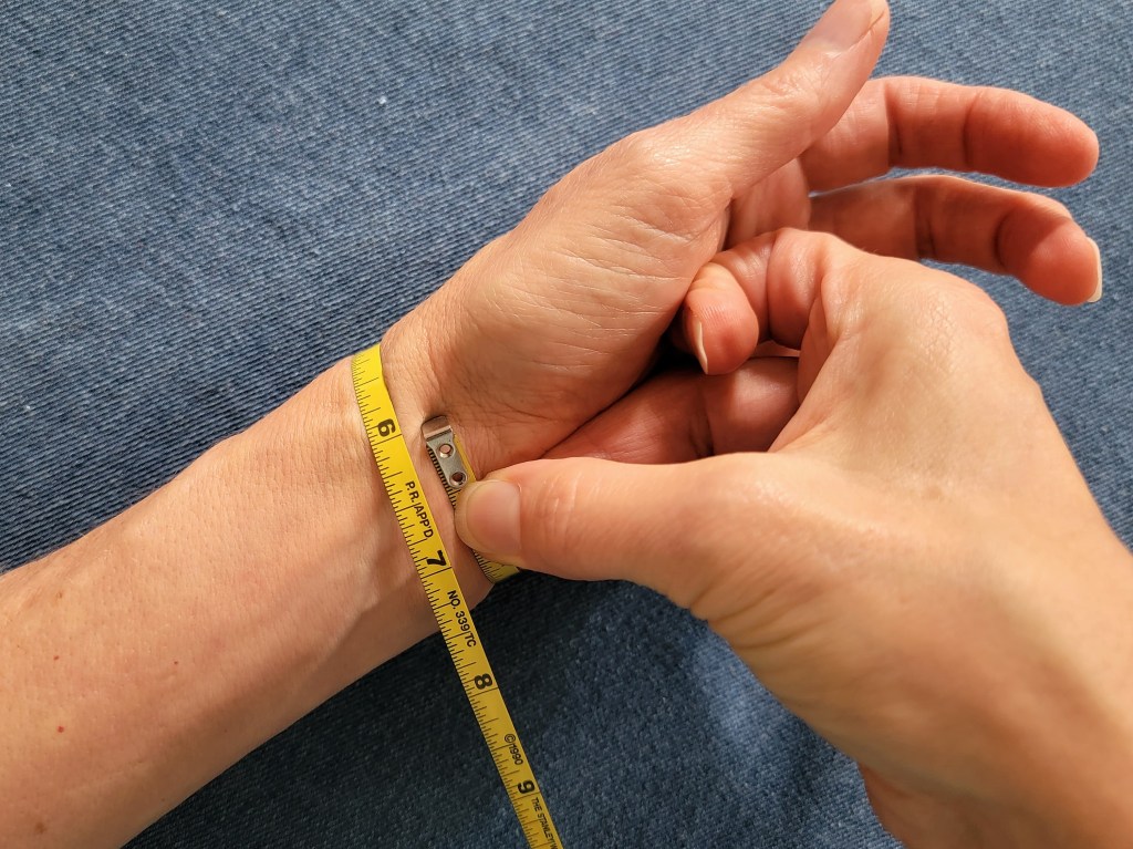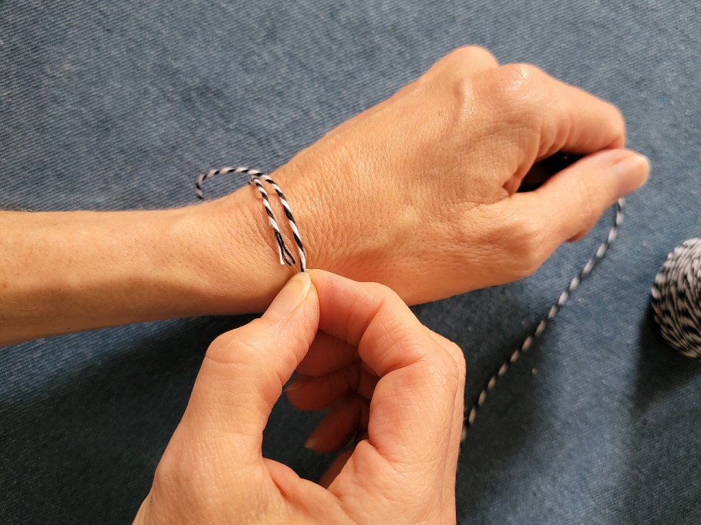 Let’s start with finding your wrist size. Use a string or ribbon to wrap around your wrist, and then either mark or hold the spot it reaches: