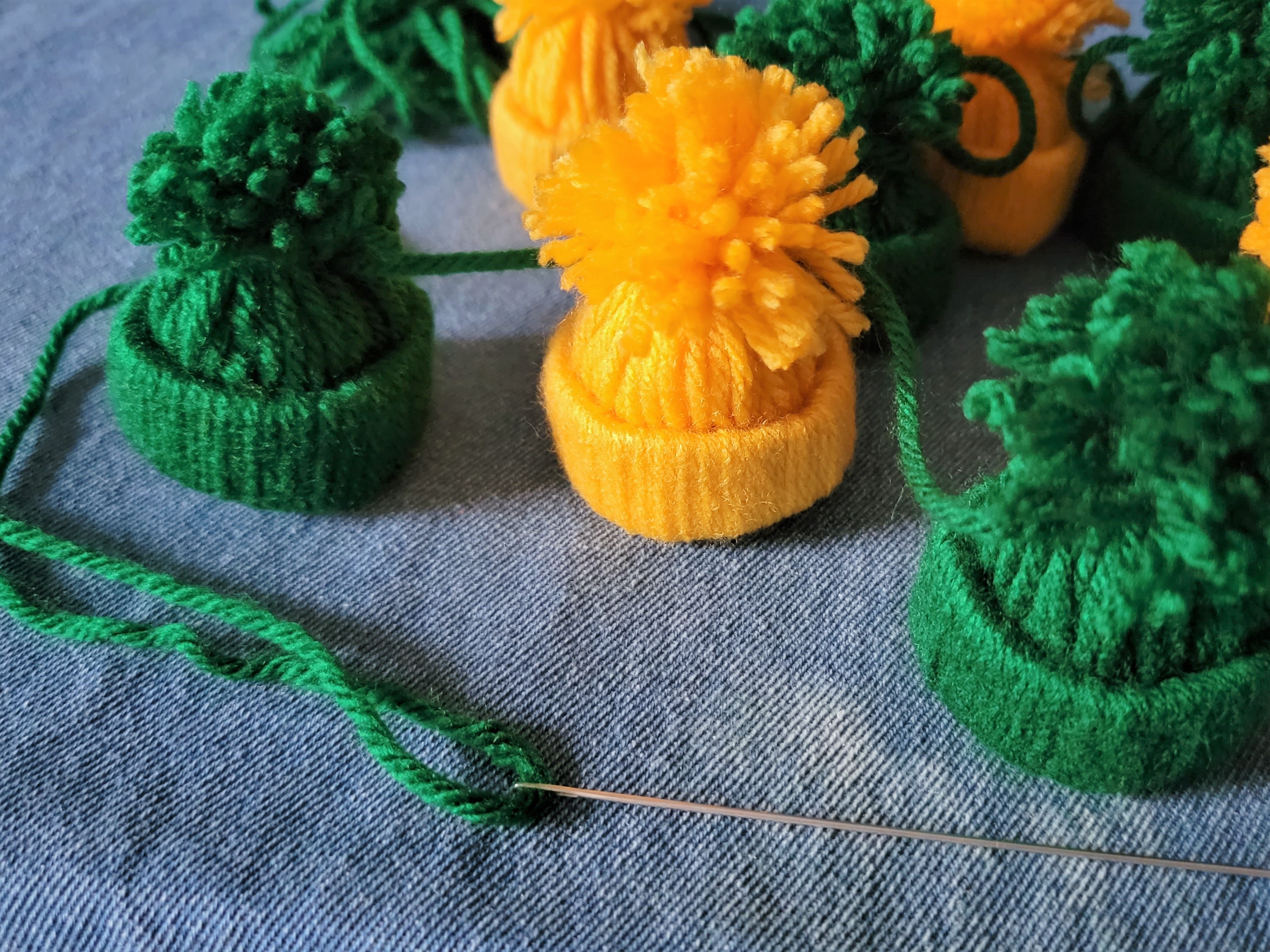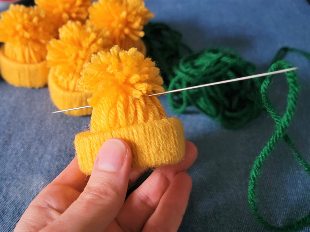 String up your hats on this long piece of yarn. I used a needle that had an opening big enough for my yarn, but if you don’t have one, you could tie your yarn to a small safety pin, or just carefully use your fingers to push the yarn through each finished hat.