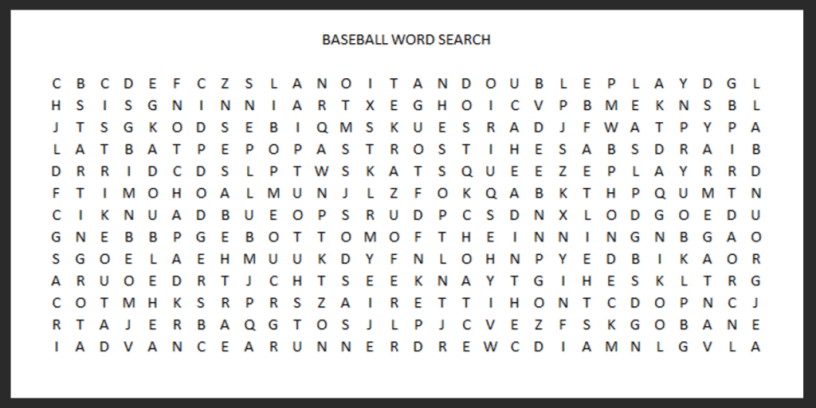 Download the free baseball word search game, print out as many copies as you need, and have a competition to see who can find all of the words first! The words are all common baseball terms, plus the team that will win the Championship (guaranteed)!