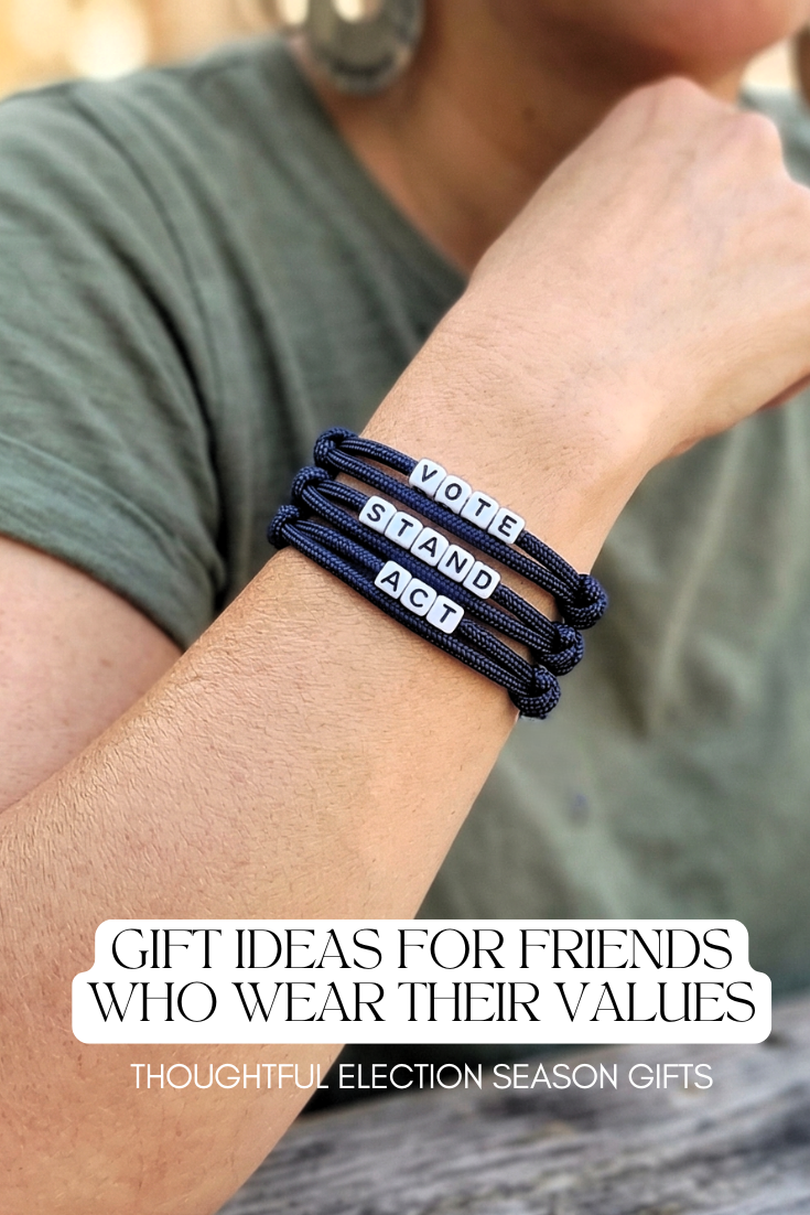 Jewelry can be more than an accessory. A bracelet with words like RESIST, VOTE, HOPE, UNITY, or COURAGE can serve as a daily reminder of what matters most.